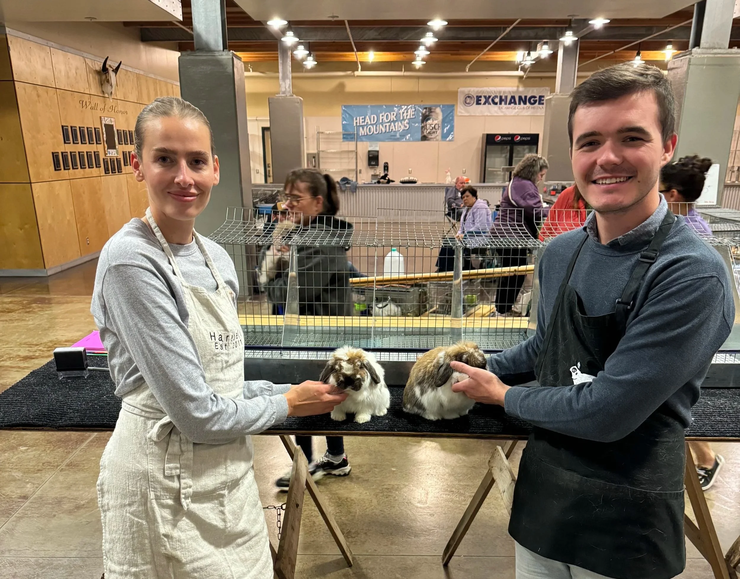 GC Harebell’s Saltburn (left) & GC Harebell’s Cascade (right) winning BOB & BOS at the 2025 Big Sky Rabbit Habit show under judge Griffin Harrah